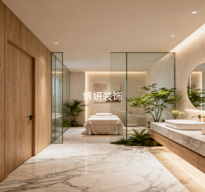 护理空间更是把“隐于自然”的巧思做到极致,玻璃隔断让光线自由穿梭,疗愈床旁的绿植与艺术装置相映,每一次护理都是在自然怀抱里的身心舒展。前台的大理石肌理与品牌标识交辉,木质拱门似在邀请都市人踏入这片远离喧嚣的疗愈场域。